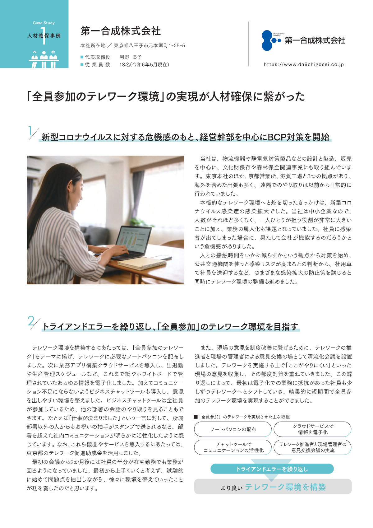人材確保 事例集 新たな人材の採用や、既存従業員の離職防止など、テレワークによる人材確保の効果を得られた企業の事例をご紹介。 株式会社キャリア・マム 第一合成株式会社 株式会社HQ 株式会社フロンティアコンサルティング ⤢ 01/10 ✕ 01/10 PDFをダウンロード (1.38MB)