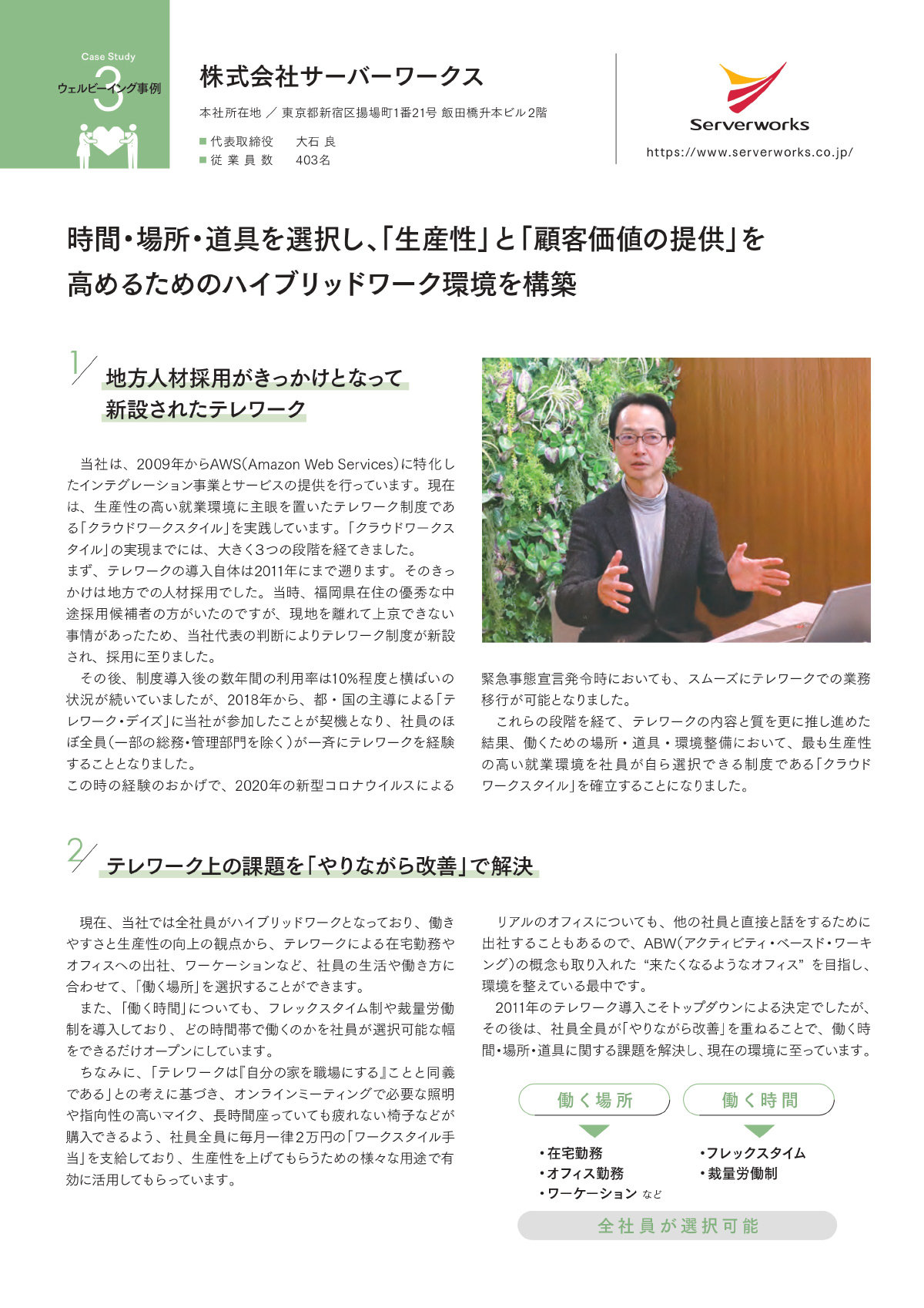 ウェルビーイング 事例集 テレワークの導入により、従業員のライフスタイルを尊重したウェルビーイングな働き方を実践している事例をご紹介。 株式会社ティア 株式会社ロータス 株式会社サーバーワークス ⤢ 01/10 ✕ 01/10 PDFをダウンロード (1.36MB)