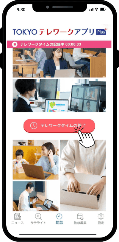 ❶アプリのホームにある、「テレワークタイムの開始」ボタンを押すと登録が開始します。